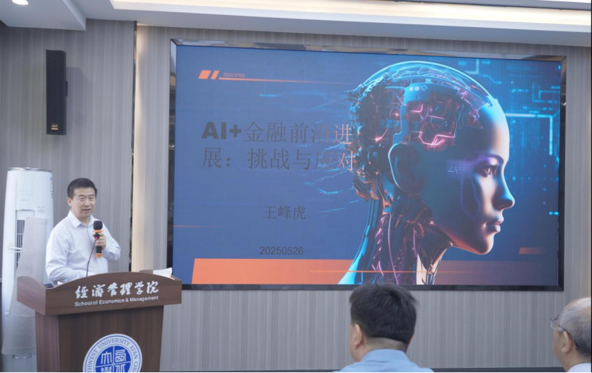 我院金融系副主任王峰虎带来《AI+金融前沿进展:挑战与应对》主旨演讲。王老师分享了AI技术在风险管理、算法交易、个性化金融服务、区块链金融等领域的前沿应用,指出AI与金融相融合,可以全面提升金融服务效率、智能化水平和金融安全性,实现金融业务从经验驱动到数据驱动的模式转变。王老师解析了“AI+金融”从单点融合到协同创新的融合路径,分析了从“服务中介”到“智能中枢”产业生态演进趋势,探讨了面临的技术瓶颈、监管困境及“AI+金融”复合型人才培养改革。