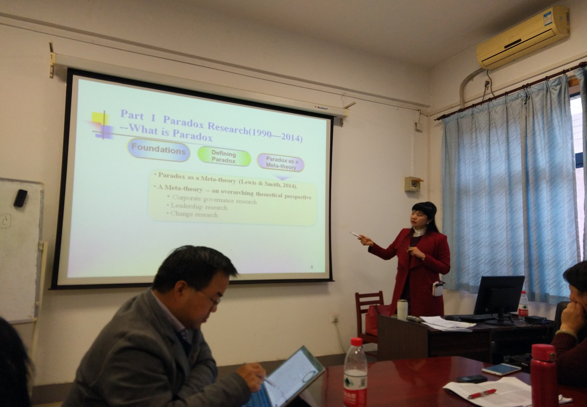 谭乐老师在本次沙龙中的报告主题为“管理科学中的悖论研究及思考”。报告首先介绍了“悖论”这一概念的哲学和心理学理论基础及其概念界定;其次,对近25年来管理领域悖论相关的研究文献进行了内容分析和梳理,分别介绍了6个关键主题,它们代表了悖论元理论的基石;再次,将悖论思想引入到领导科学研究中,进一步介绍了与悖论相关的两个较新的领导行为概念——悖论式领导和辩证式领导;最后,报告分别从整体视角以及领导力研究视角分别总结了未来研究方向及相关议题。