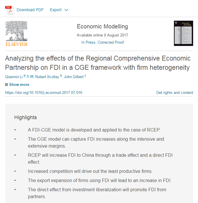 我院世界经济与贸易系教师李侨敏博士的论文《Analyzing the effects of the Regional Comprehensive Economic Partnership on FDI in a CGE framework with firm heterogeneity》在SSCI检索期刊《Economic Modelling》上在线发表,论文链接:http://www.sciencedirect.com/science/article/pii/S0264999317301773