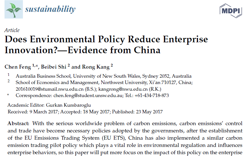 近日,我院2015届本科毕业生冯晨、博士生史贝贝在康蓉副教授指导下完成的合作论文《Does Environmental Policy Reduce Enterprise Innovation?—Evidence from China》在SSCI&SCI双索引期刊《Sustainability》上在线发表。(论文链接:doi: 10.3390/su9060872)。该文是康蓉副教授主持的国家社科基金“全球气候变化谈判困局及中国积极参与应对研究”的阶段性成果。