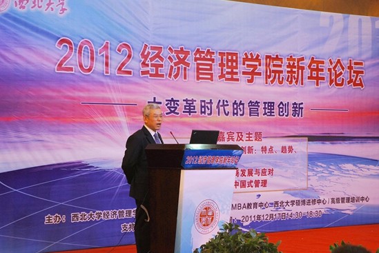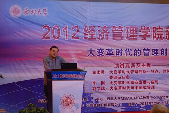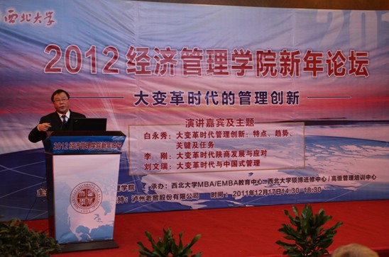 活动分为两个模块,下午是以“大变革时代的管理创新”为主题新年论坛,晚上是以“E满新春”为主题的新年联谊会。在论坛活动环节,邀请到三位教授进行主题演讲:(1)白永秀教授的演讲题目是“大变革时代管理创新:特点、趋势、关键及任务”。白教授认为大变革时代就是管理创新的时代,大变革时代在创新层次、创新内容、创新方式等方面均呈现新的特点,管理创新显现5大趋势,管理者需要用30条定律来武装自己,以便应对大变革。(2)李刚教授的演讲题目是“大变革时代陕商发展与应对”。首先是陕商的发展过程,陕商是中国历史上最先产生的商帮,是天下第一商帮。接着讲述了陕商的重要活动,最后对大变革时代陕商应该树立8大核心价值观。(3)刘文瑞教授演讲题目“大变革时代与中国式管理”。刘教授从创新范畴界定入手,重点讲述中国式管理的内涵、特征及对中国式管理实践的反思。776net必赢官网院长任保平主持了论坛并做了精彩点评和总结。此次论坛为学员认清时代特征,积极做好应对,促进管理人才的共同交流与提升提供了宝贵机会。