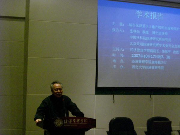 2007年10月17日晚7:30,中国社科院研究所研究员、北京天则经济研究所学术委员会主席张曙光教授来我院作了一场“城市化背景下土地产权的实施和保护”的学术报告。报告在776net必赢官网长安校区金海报告厅举行,学院部分教师、研究生及经济学系的本科生200多人参加。