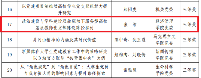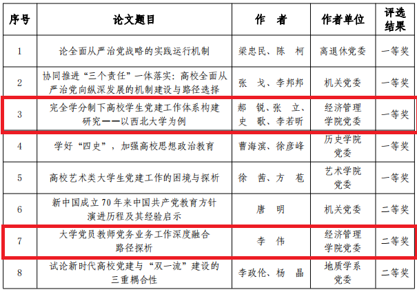 6月1日,学校公布了布西北大学 2020 年度党建理论研究征文评选结果,我院党委获优秀组织奖;我院学生党支部书记郝锐等,财政与税收系党支部书记李伟,工商管理系党支部书记张洁的作品分获优秀征文一、二、三等奖。该项活动由学校党委办公室和学校党委组织部组织,2020年8月启动,在全校所有党委(直属党支部)中开展,学院党委积极组织师生党员参与,提交了多篇征文作品。