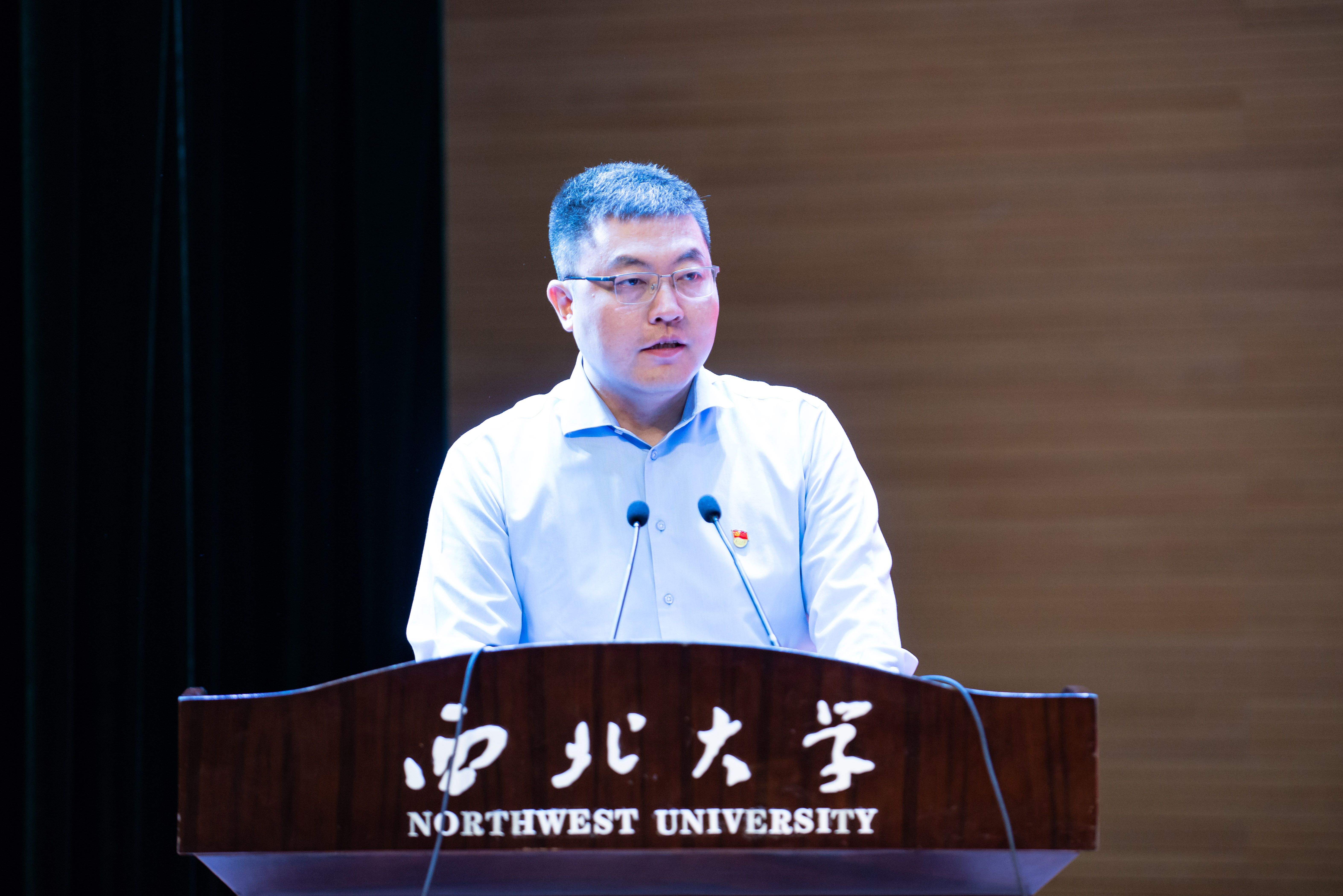 陕西陕核投资有限公司总经理徐腾作为优秀校友发言。他结合自己学习工作感悟,鼓励学弟学妹主动思辨,持续学习将是事业发展的重要动力,并希望大家心系母校,为西大品牌服务,贡献自己的力量。