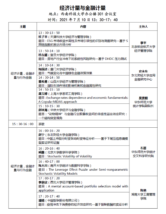 第三届管理科学与工程学会金融计量与风险管理分会学术年会于2021年7月9-11日在四川省绵阳市举办,该会议邀请了四位国际著名专家学者(中国工程院院士陈晓红教授、中国科学院特聘研究员、发展中国家科学院院士、著名经济学家汪寿阳教授、普林斯顿大学运筹与金融工程系著名统计学家范剑青教授,芝加哥大学商学院金融学专家与统计学家修大成教授)做大会报告,同时从接受的众多论文中遴选了30篇论文进行汇报交流,论文作者来自于北京大学、复旦大学、厦门大学、南开大学、华东师范大学、中国科学技术大学、中国银联股份有限公司等全国多所高校和企业。