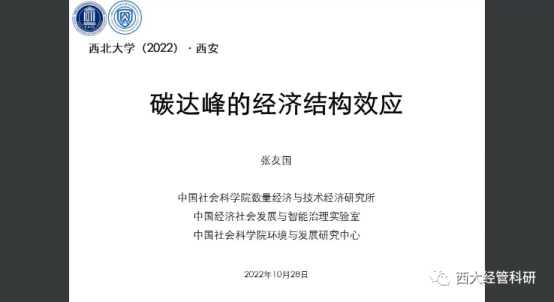 10月28日,中国社会科学院数量经济与技术经济研究所副所长张友国教授做了题为《碳达峰的经济结构效应》的学术讲座。他结合二十大精神和中国绿色发展的实际,从中国式现代化是人与自然和谐共生的现代化的视角强调了碳达峰的重要性,并介绍了中国的碳治理体系,指出中国未来碳治理体系逐步转向碳排放治理和强度“双控”制度。在此基础上,介绍了碳减排与经济结构变化之间的研究,指出碳减排经济结构影响研究领域仍存在较大拓展空间。 张教授分析了碳达峰的经济结构影响机制包括:局部均衡效应,一般均衡效应和不确定性;并从模拟的角度介绍碳达峰是怎么影响经济结构,模型和情景的设计;最后,基于实验结果,介绍了其研究的结论:理论上碳达峰对经济结构变化的影响具有不确定性;碳达峰有利于优化居民消费和出口产品结构,但可能抑制消费比重和总需求中服务份额上升;碳达峰的需求结构效应、产业结构效应和能源结构效应之间可能存在不协调性;碳达峰影响经济结构变化的同时,也会影响经济总量变化。