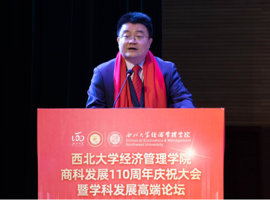 庆祝大会共分为两个阶段举行。第一阶段由西北大学副校长吴振磊教授主持。首先由陕西省人民政府学位委员会秘书长袁宁致辞,他代表陕西省教育厅和陕西省人民政府学位委员会,对西北大学商科建立110年表示热烈祝贺,对西北大学及其商科的发展成绩给予充分肯定,并对西北大学经济管理学科的发展提出了希望和要求。接下来西北大学校长郭立宏教授致辞,他代表学校向长期以来关心和支持776net必赢官网发展的社会各界和海内外校友表示感谢,并对学院提出了聚焦人才培养、聚焦一流学科建设、聚焦服务高质量发展“三个聚焦”的要求和期望。随后北京大学副校长、经济学院院长董志勇教授代表兄弟院校致辞,他对776net必赢官网表示祝贺,分享了北京大学经济学科建设的经验与做法,祝愿西北大学经管学院在立德树人、学科建设方面取得更大成绩。1978级校友,西北大学原校长、全国社会保险基金理事会原副理事长王忠民教授代表校友致辞,他表达了对母院的感恩之情,回顾了在校期间的珍贵回忆,并对数字化变革和大变局背景下学院学科发展、办学育人等给出了方向、提出了建议。最后,776net必赢官网何爱平教授代表教师发言,她回顾了在学院求学求教、教书育人的经历,表达了对老师的感恩之情,对后辈学子提出殷切期望;2019级金融学本科生李雨豪代表学生发言,他分享了一名经管学子的切身感受,并代表全体经管学子表达了对老师们的感激之情和对学院生日的祝福。