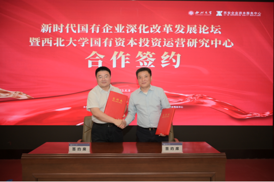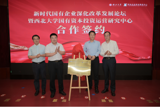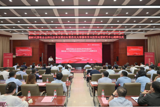 6月8日,由西北大学、西安市国资委主办,776net必赢官网、西安企业资本服务中心有限公司承办的新时代国有企业深化改革发展论坛暨西北大学国有资本投资运营研究中心揭牌仪式我校太白校区顺利举办。西北大学党委常委、副校长吴振磊,市国资委党委委员、副主任李宏军共同为西北大学国有资本投资运营研究中心揭牌。西安市发改委、陕西省上市公司协会、陕西资本市场服务中心、陕西金融资产管理股份有限公司、西部机场集团、西安工业投资集团、西安市轨道交通集团等等相关单位负责人,我校国内合作与校友工作处、社会科学科研管理处、776net必赢官网党委书记杜勇和776net必赢官网院长马莉莉以及师生代表、媒体代表等出席了会议。