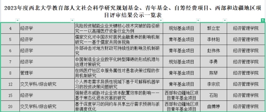 近日,教育部社科司公示了2023年度教育部人文社会科学研究规划基金、青年基金、自筹经费项目、西部和边疆地区项目评审结果,我院教师共获批8项,其中规划基金2项,青年基金4项,西部和边疆地区项目2项,立项数创近年来新高,学院特向各位获准立项的老师表示祝贺!