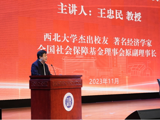 11月17日,杰出校友、著名经济学家、全国社会保障基金理事会原副理事长王忠民教授做客我校“侯外庐学术讲座”第三百二十一讲、经管学院“炼成讲坛”第二讲、第四届“开源证券-西北大学”创新人才实验班开班第一讲、西北大学MBA/EDP“名家面对面”第十三讲,在长安校区学生活动中心为师生作了题为《数智绿色时代与金融高质量发展》的学术讲座。校党委书记王亚杰出席并致辞,讲座由校党委常委、副校长吴振磊主持。
