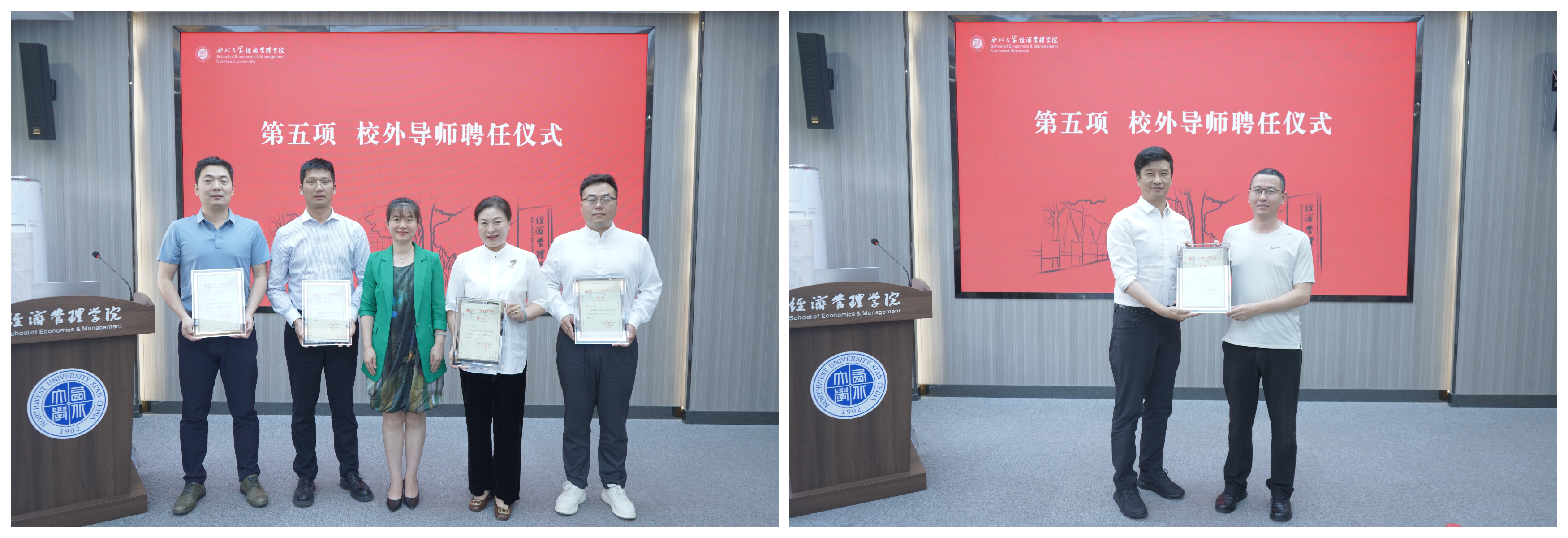 开幕式第五项为颁发校外导师聘书。由776net必赢官网马莉莉院长为西安城墙管委会吴春副主任、西安城墙数字产业创新中心总监赵彬、西安城墙数字产业创新中心副总监吕俊峰等颁发数字经济专业硕士校外导师聘书。由776net必赢官网李辉副院长为西安城墙管委会主任助理兼城墙旅游公司总经理苏宁颁发MBA校外导师聘书。