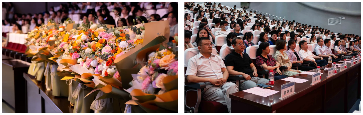 典礼第三项:学院领导和各系教师代表向2024届本硕博毕业生代表赠送了学院精心准备的纪念品黑檀木书签、签字笔和全院师生大合影,书签上雕刻着“潮涌海阔,千帆竞秀”的赠言和宏观经济大楼图案,表达了学院对毕业生的殷切期望和祝福期许。