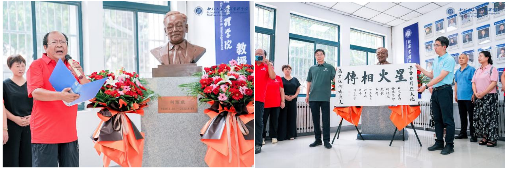 下午,举办了1980级校友向何先生塑像献花和纪念仪式。郭勇校友深情诵读了他创作的《那盏灯——献给敬爱何炼成老师和我们的经管学院》,石高宏校友捐赠了楹联书法作品。