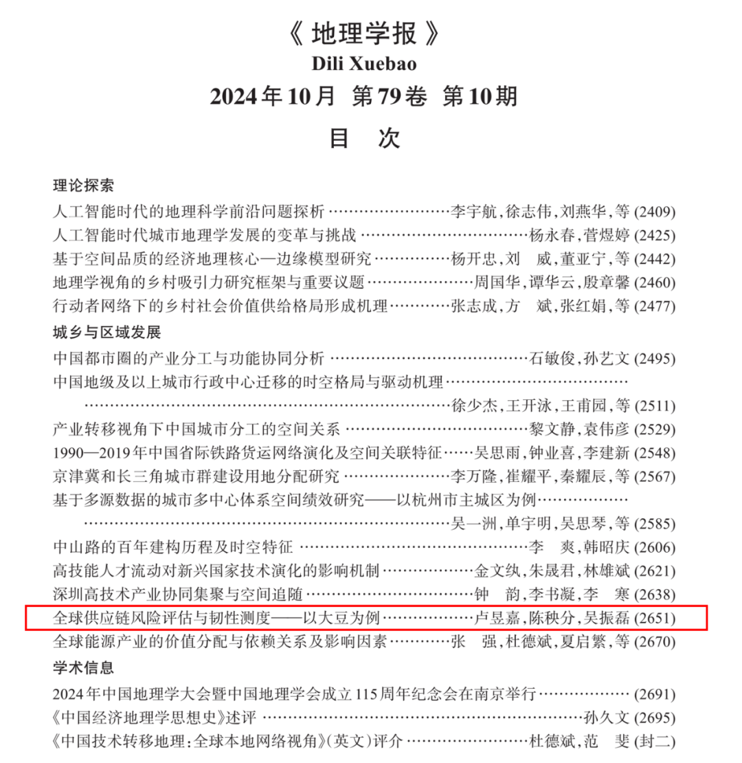 近日,我院博士后卢昱嘉和吴振磊教授的研究成果《全球供应链风险评估与韧性测度——以大豆为例》一文在《地理学报》2024年第10期发表,文章以大豆作为典型研究对象,深入分析了全球供应链的潜在风险与韧性水平。当今世界正处于百年未有之大变局,供应链韧性与安全成为各方重点关切。以大豆为代表的进口依赖型农产品供给更加取决于全球供应链系统和贸易网络运行状态,实现保供稳供面临较高的不确定性。面对有增无减的国际资源和市场利用风险,跨境供应链治理成为耦合重要农产品供求的关键因素。文章构建涵盖供应、采购、运输、需求等四个阶段和出口商、物流与运输部门、进口商等三个环节的供应链分析框架,定量评估了大豆全球供应链的风险与韧性水平。研究发现,近年来,大豆进口供应链整体风险不断上升,风险主要来自需求和采购阶段,与出口国的贸易关系、经济政策不确定性是影响大豆进口供应链安全的长期风险因子。中国自巴西进口大豆供应链的整体韧性相比美国和阿根廷较强,显示了与巴西探索优化供应链协作的充分潜力。本文不仅可为更好地利用国际资源与市场、保障农产品进口安全提供科学依据,也可发展典型产品跨越地理空间的风险韧性治理理论与方法,拓展资源地理研究。