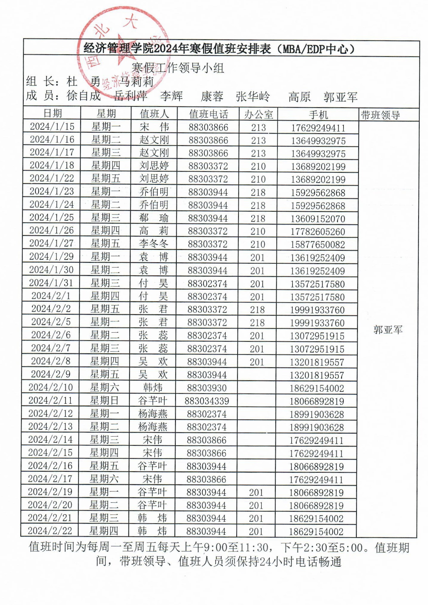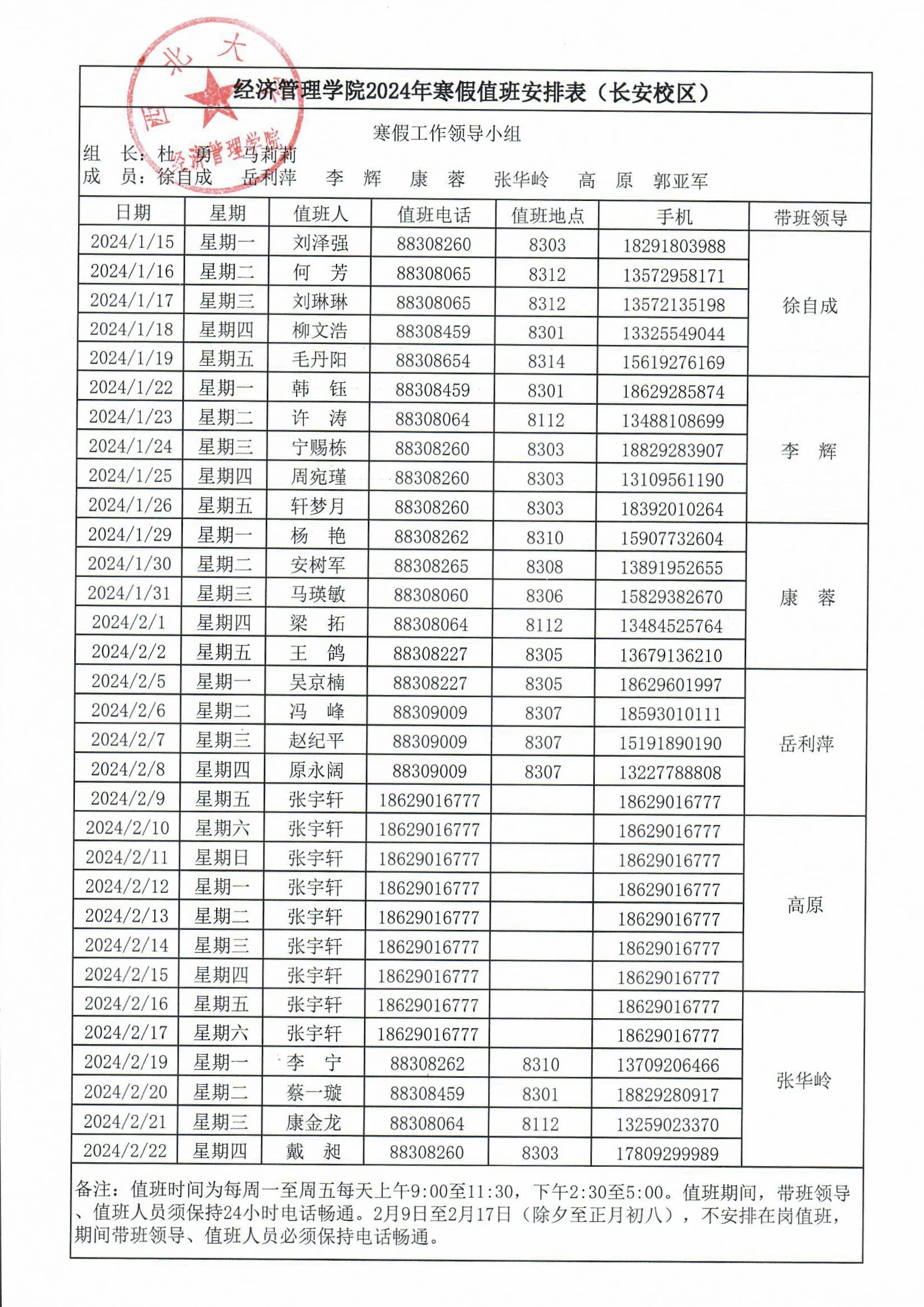 776net必赢官网2024年寒假值班安排表