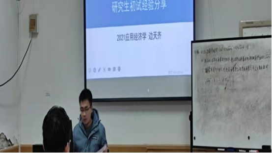 在理论经济学交流分享会上,吉展慧同学针对政治、数学、英语与专业课不同科目具体阐述了不同的学习方法。她强调成功需要正确的方法,需要时刻关注与紧跟专业教师指导的脚步,查缺补漏,匀速前行。夏雨轩同学根据自身经验,就如何避免考研的弯路进行了分享。第一,要做到全面复习,侥幸心理只会成为考研之路最大的绊脚石,不会的知识点很可能成为考试的重点;第二,着重提高做题效率,通过不断做题加强自身的计算能力,拓展了解相应的解题技巧会让答题速率事半功倍;第三,适当运动,保持健康,身体是革命的本钱,每周抽出适当的时间进行锻炼,为考研打下坚固的体能基础。