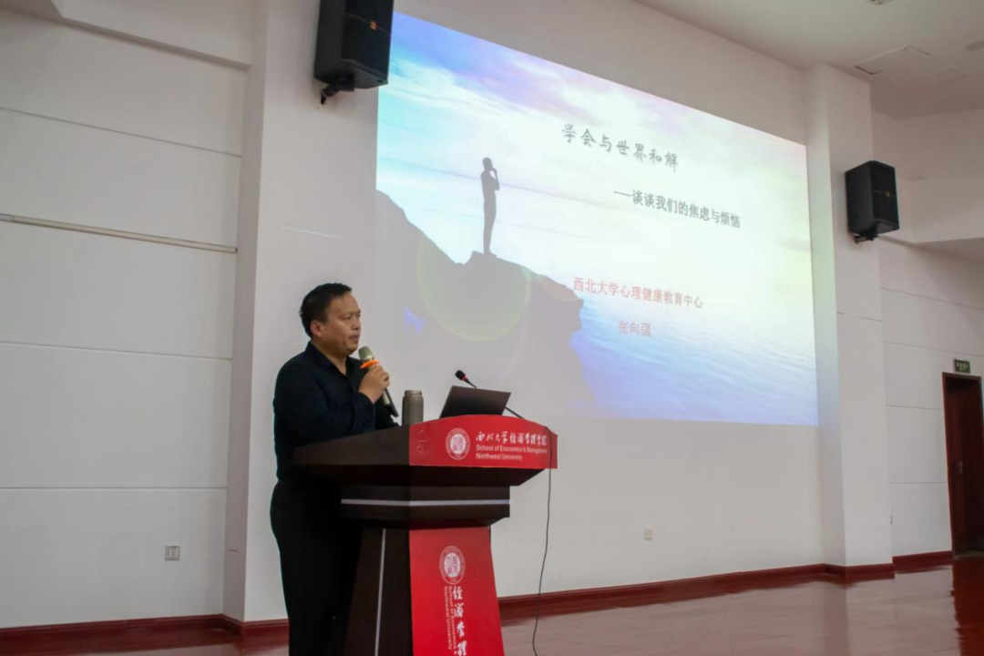 讲座围绕“学会与世界和解——谈谈我们的焦虑与烦恼”开展。张向强指出人们生活压力增大的社会现况,引导同学们为自己的压力值评分,指出应当客观看待自己的情绪;提到“敏感”所带来的影响,并告诫同学们应该在合理的范围内保持敏感,同时也不要精神内耗,导致过度焦虑。