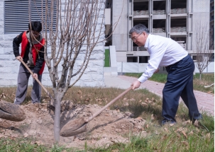 本次活动共植30株西府海棠,由776net必赢官网1984级政治经济学校友宋立捐赠,其中3株栽植于太白校区著名经济学家、教育家何炼成教授办公室的窗下,27株栽植在长安校区宏观经济大楼前。