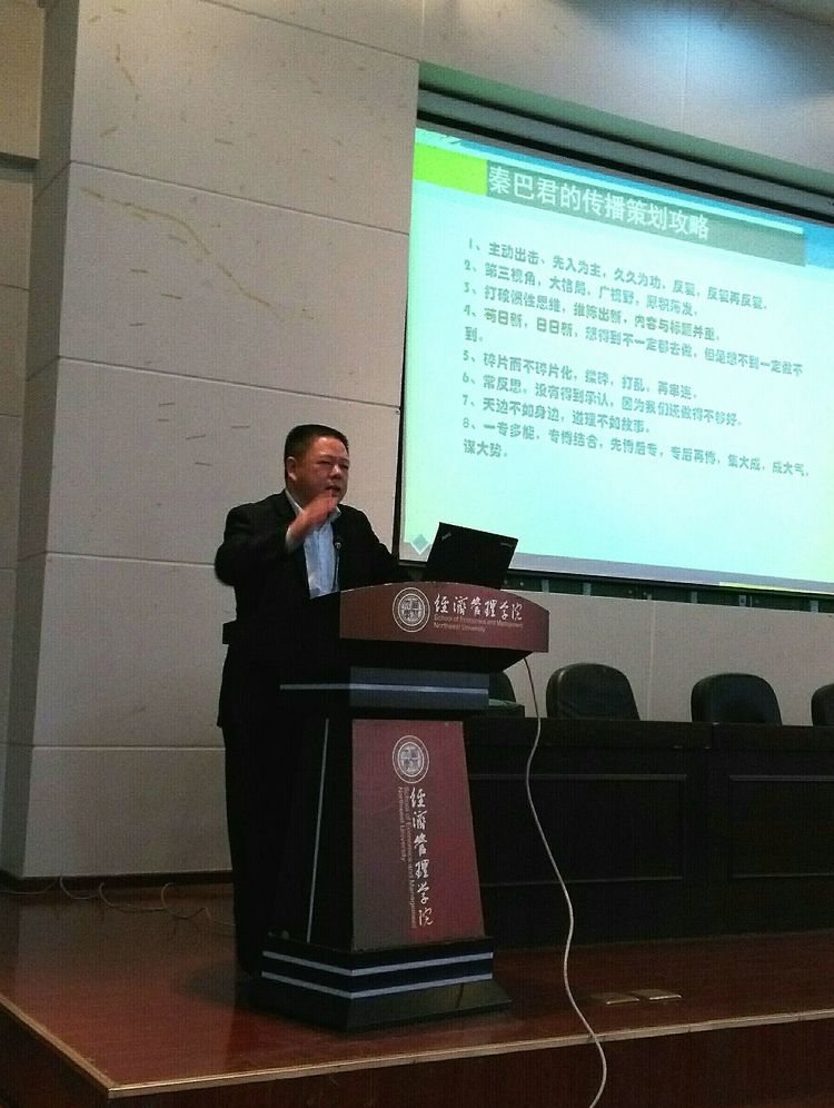 曹辉局长长期从事生态旅游工作,具有丰富的工作经验和扎实的理论功底,他结合自己的工作实践,详细阐述了新时期互联网的特点、互联网思维的取向、互联网传播的特点,分享了他对“互联网+”时代的认识和理解。并就“互联网+”时代下安康旅游开发工作的思路和做法同在场师生做了详细交流。曹辉局长还分享了自己在旅游开发宣传工作中的文案撰写、微博微信传播策划过程中的经验。
