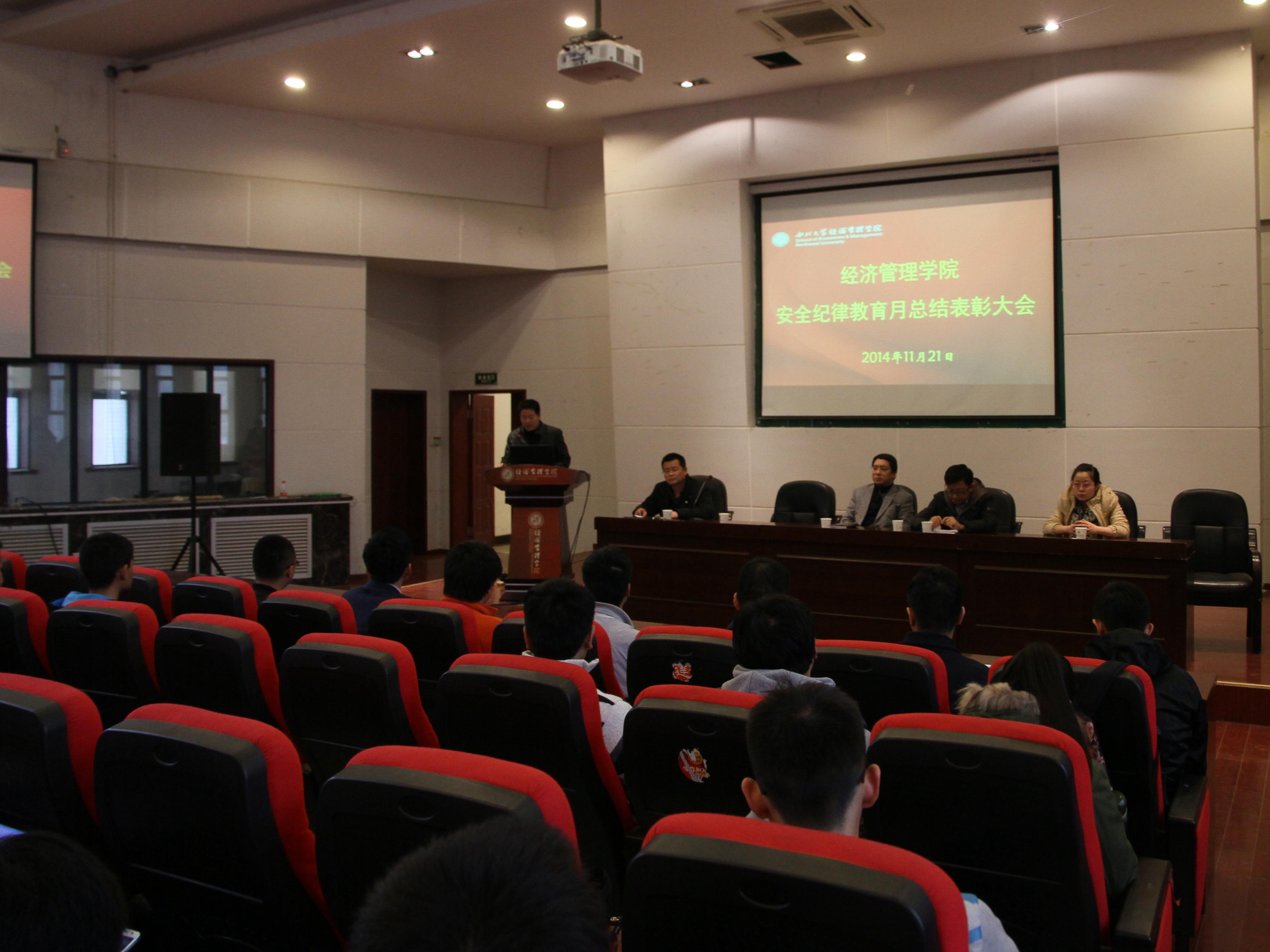 11月21日下午,学院在金海报告厅举行了2014年安全纪律教育月总结表彰大会,院党委书记李国良,副书记李一凡出席,各年级辅导员及学生代表共计200余人参加了大会。