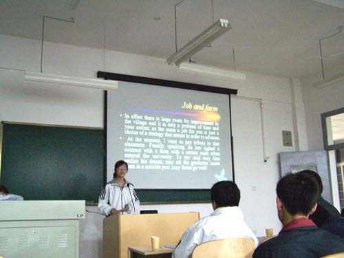 第三位同学就”farm and job”主题深刻剖析了大学生在择业方面所存在的问题,督促大家要树立正确的就业观,认真选择职业,充分体现大学生的优秀品质,为祖国做贡献,正如这位同学所说,毕业后他将回到他的家乡,为他的家乡作出自己的贡献。