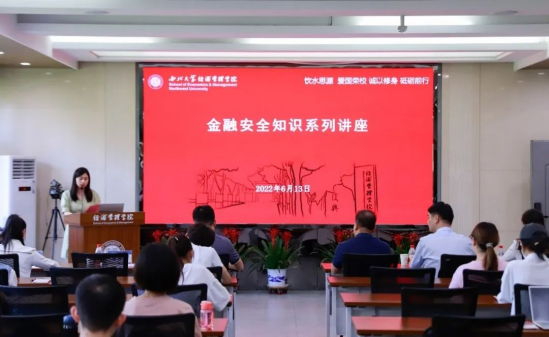 为进一步普及金融安全知识,有效提升学生征信保护意识和防范金融诈骗的能力,6月13日下午,776net必赢官网联合西部证券举办“饮水思源 爱国荣校 诚以修身 砥砺前行”金融安全知识讲座。本次讲座由西部证券何沛、何兆飞主讲,学生工作部(处)郑曙光和50名学生出席了本次活动,讲座由周宛瑾主持。